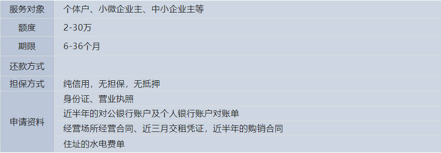 面向微型企业的股东和实际控制人,个体工商户的老板推出的贷款产品,采取纯信用的方式发放贷款,手续简单,放款快捷,是有融资需求、企业经营稳定的各位企业主、股东、实际控制人、老板的最佳选择。
