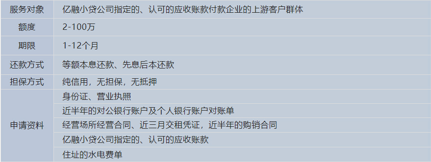 面向亿融公司指定企业的上游客户推出的贷款产品,采取纯信用的方式发放贷款,手续简单,放款快捷,是有融资需求、企业经营稳定、为亿融公司指定的企业的上游客户的各位企业主、股东、实际控制人、老板的最佳选择。